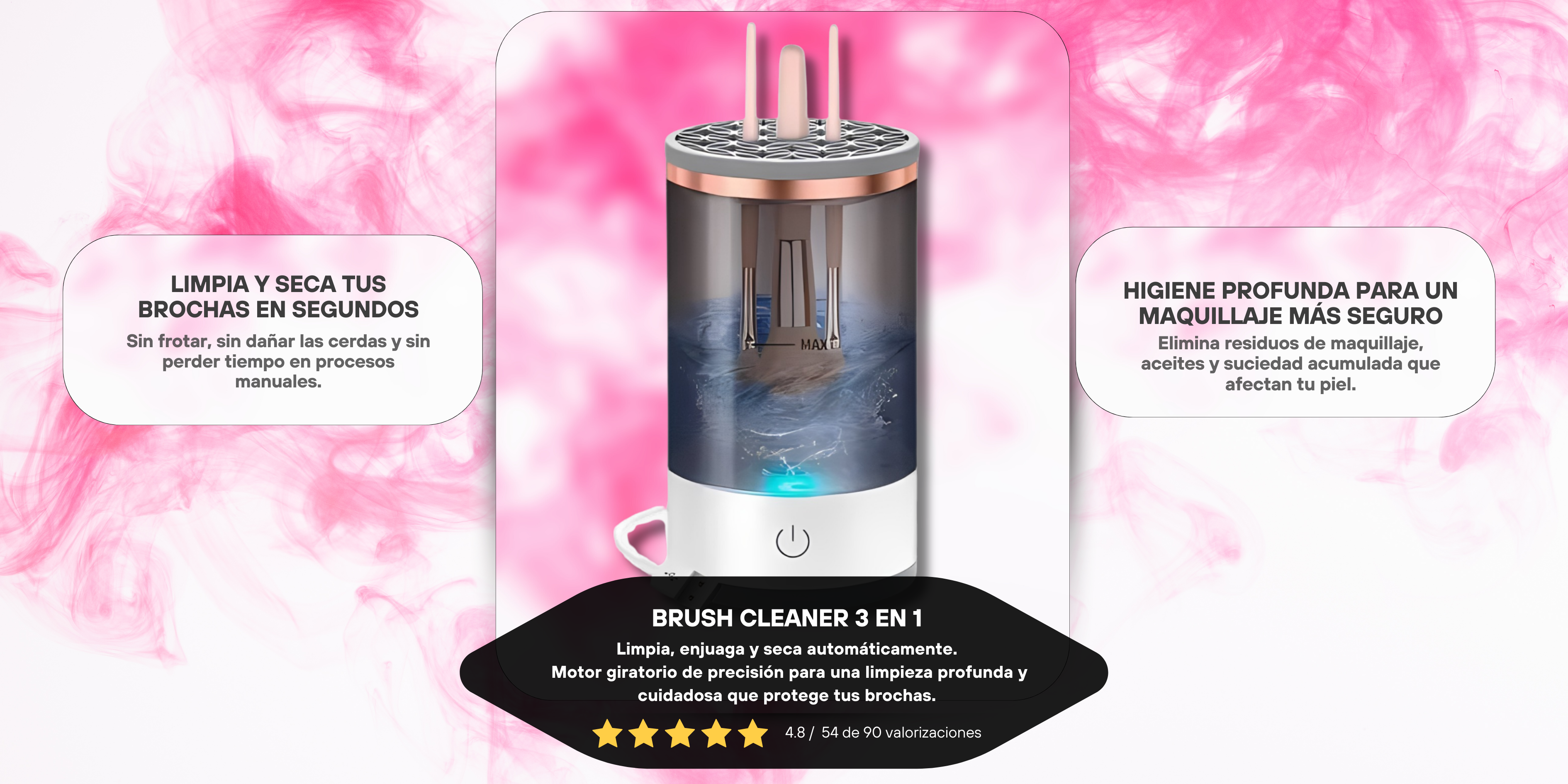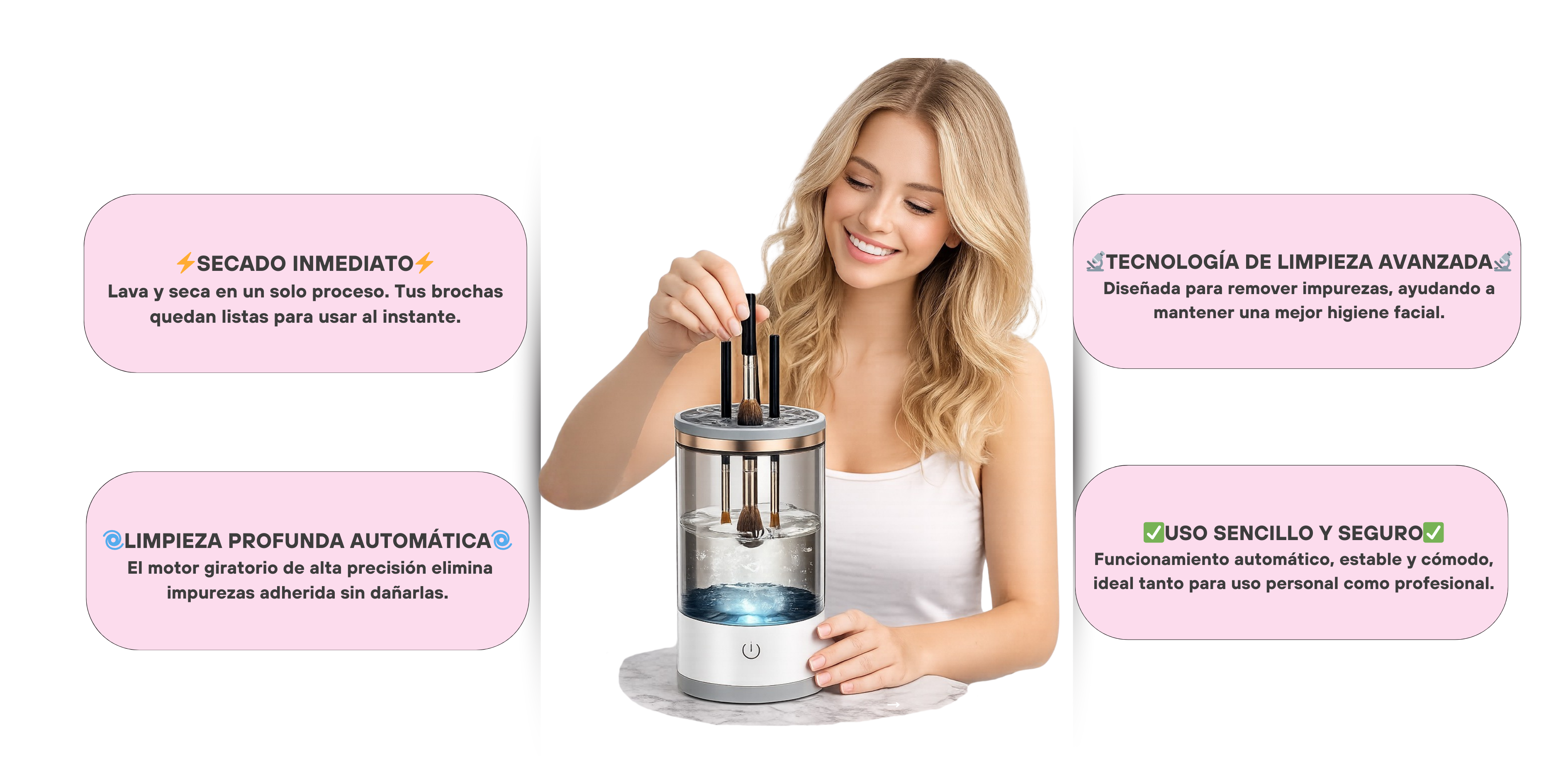 El proceso es rápido y eficiente. En pocos minutos tus brochas quedan limpias y listas para usar, sin necesidad de frotar manualmente.